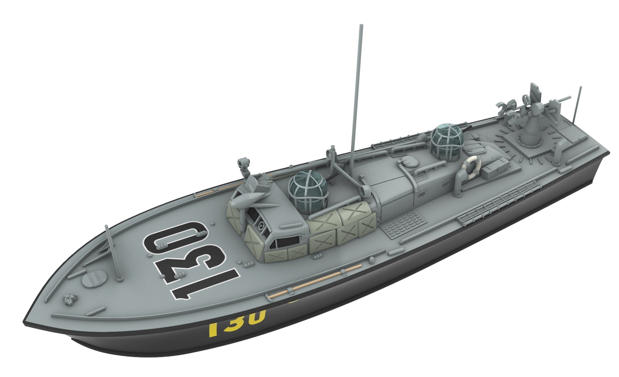 3d printed resin kit 1/350, with decals and set of eight crew figures.  Full hull, see also early version of this boat.  Measures 54mm.