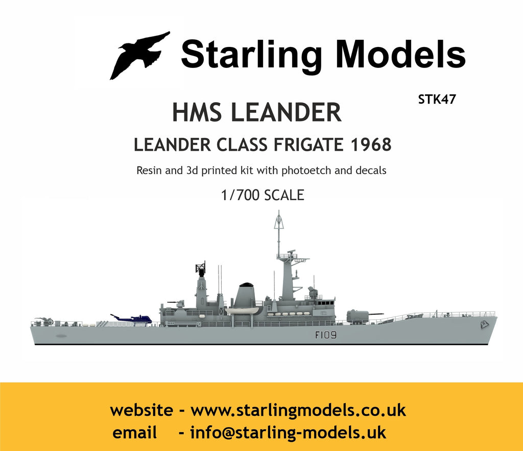 3d printed kit with photoetch and decals 1/700, waterline only. This kit shows Leander as originally fitted with all gun mount as in 1968.