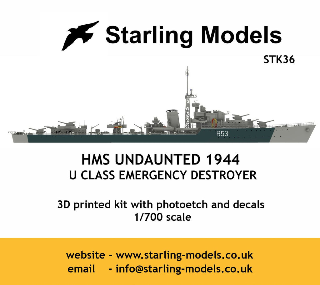 3d printed, 1/700 waterline kit with photoetch and decals. This is the U class destroyer HMS Undaunted in 1944 fit with lattice mast, updated bridge and an early version of teh late war camouflage scheme.