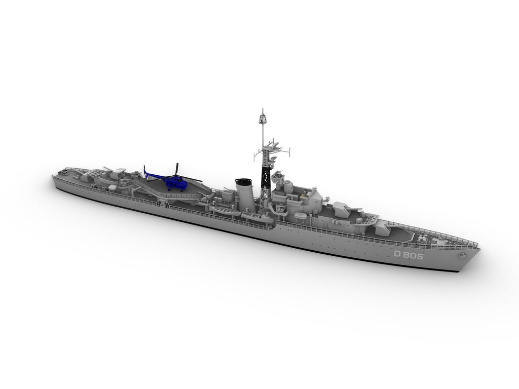 3d printed kit, 1/700 of the Royal Netherlands Navy HNLMS Piet Hein as fitted for trials for carrying a helicopter in 1956. The kit includes photoetch and decals for the ship and helicopter.