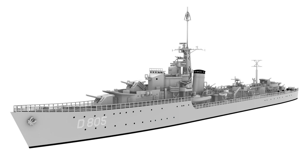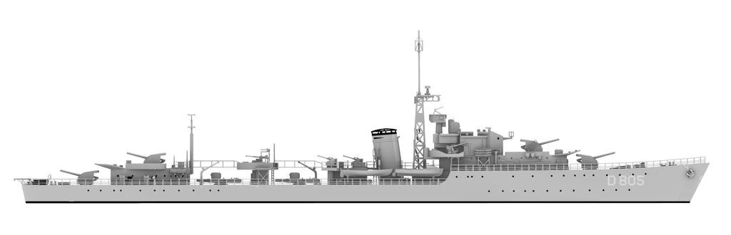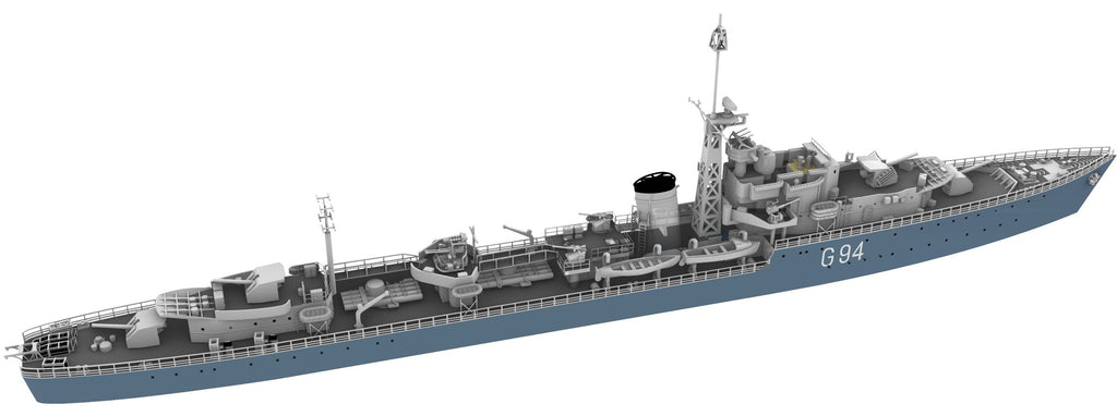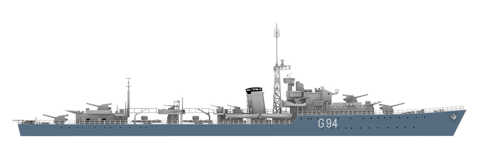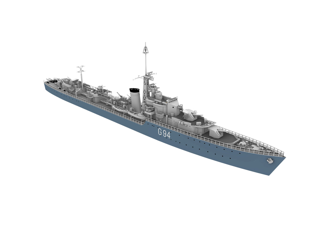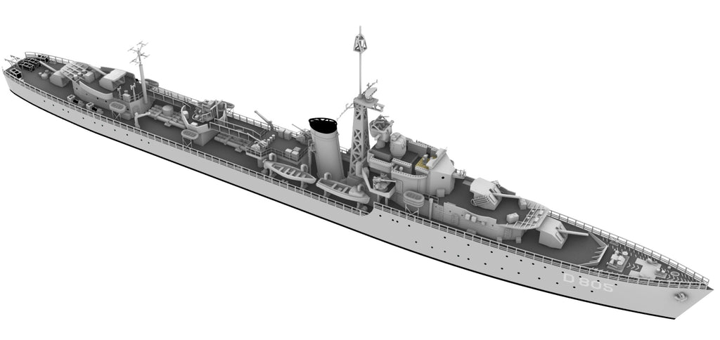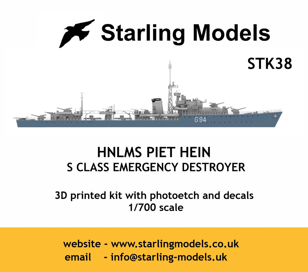 3d printed kit 1/700 of the Royal Netherlands Navy destroyer HNLMS Piet Hein. The kit shows the model either as transferred in 1946 or in the later 1956 version. Decals and photoetch are included.