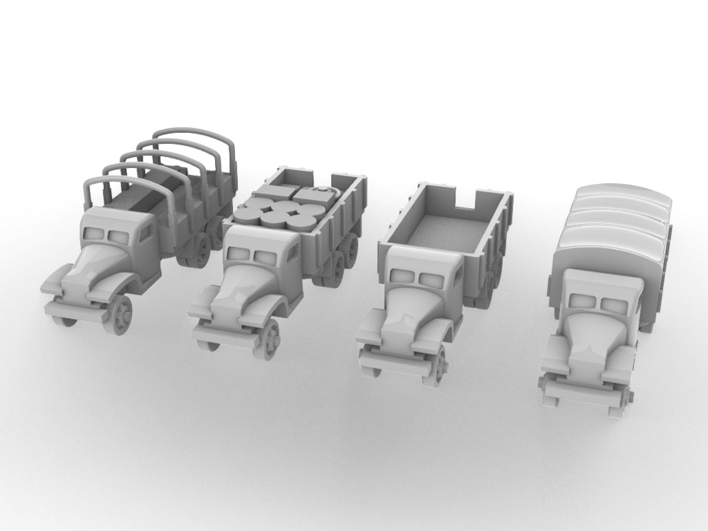 3d printed vehicles 1/700, Includes Truck with open back, open back with load, covered back and open back with frame, two of each.